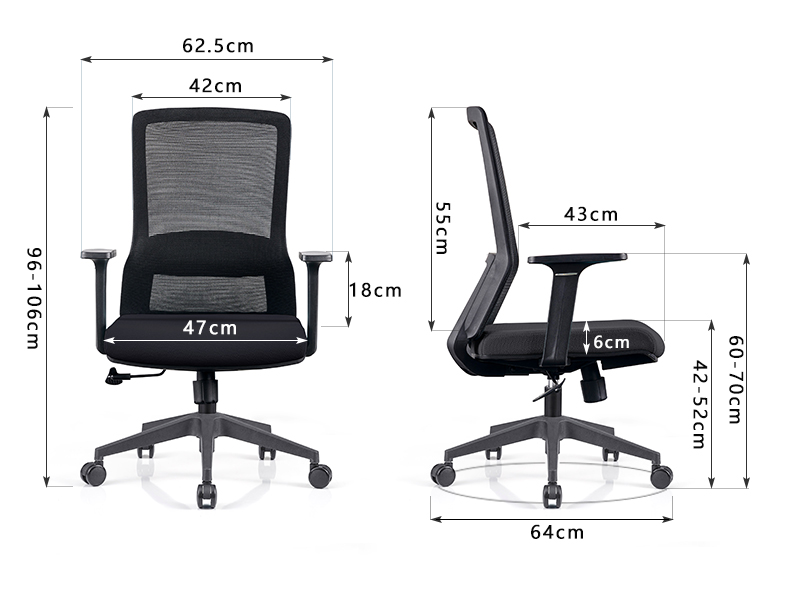 中背职员椅,1.黑色全新料加纤背框,扪华宇透气网布;2.黑色PP软质固定腰靠;3.黑色全新料加纤固定扶手;4.座包一体成型定型海绵+塑胶底壳,永不变形,扪华宇透气网布;;5. 2.5mm厚度原位锁定底盘;6.三级SGS认证气杆,100mm缩50mm;7.320mm黑色尼龙高脚,静压1000KG;8.60mm尼龙+PU静音脚轮过BIFMA。